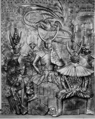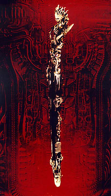 Andre Lassen The Frog dagger Silver frogs fighting a demon, 46 cm Silver, Damascus steel and black leather scabbard Photo by Susumo Sato NYC USA